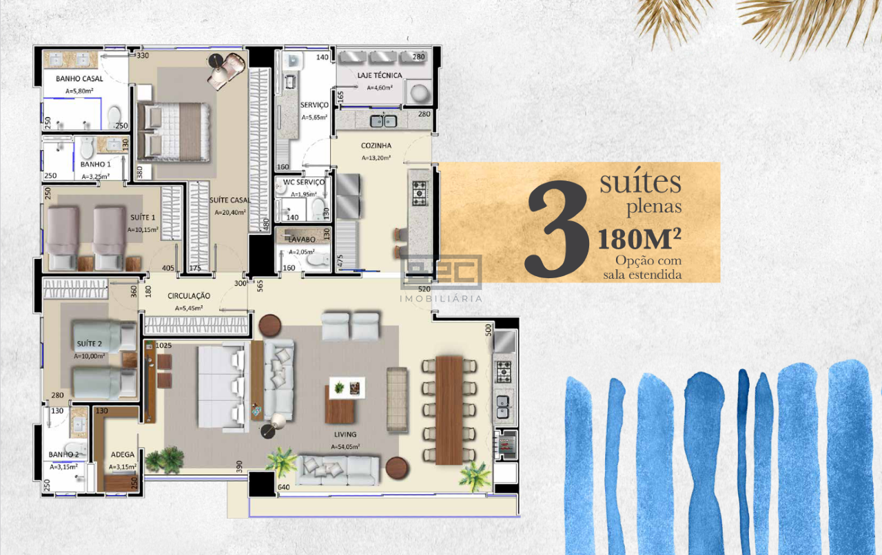 Torre única com apenas 02 apartamentos por andar de 176 m² a 180 m² e 54 pavimentos.
