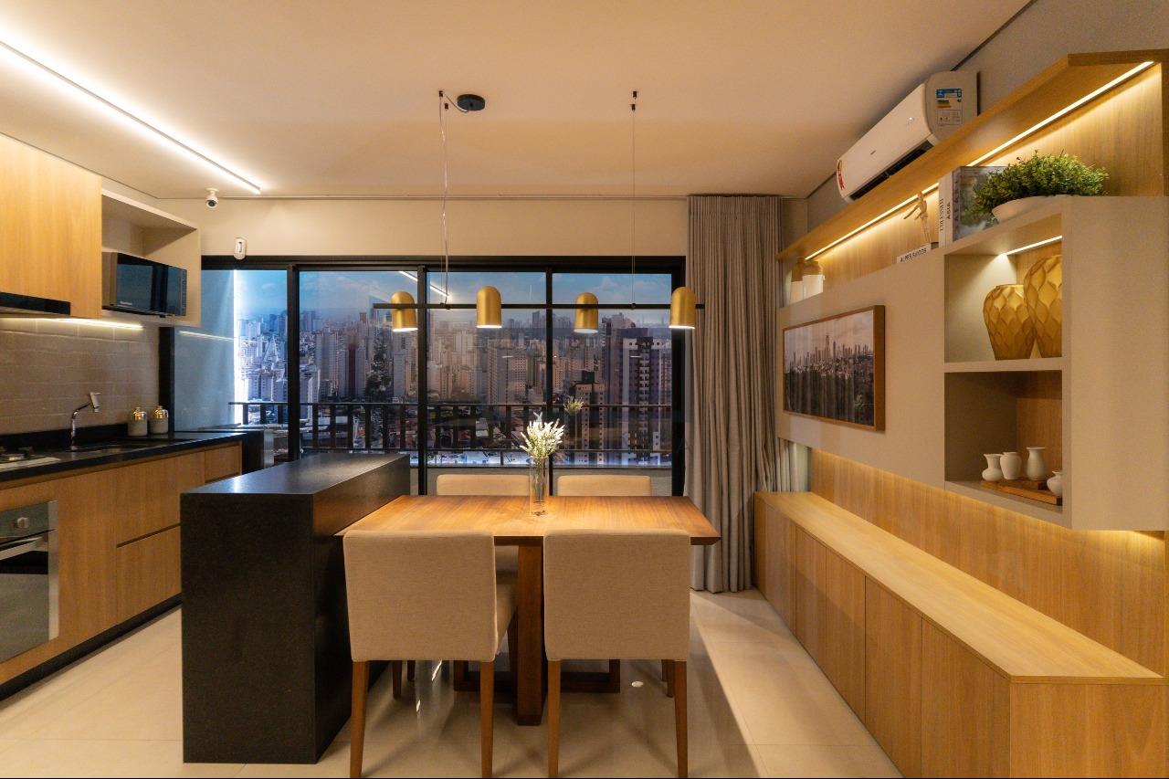 • Sala de estar, jantar, cozinha e varanda integrados
